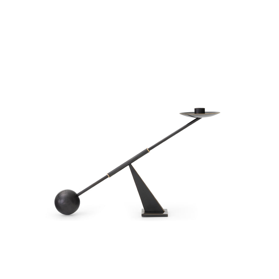 Interconnect candle holder is a bold and illuminating centrepiece of exaggerated proportions designed by Colin King. As a source of cosy candlelight, it is characterised by its deceptively simple geometric form: a sphere, an angle and a line, which unite to create a unique design. It goes beyond its intended use to function as a sculpture.