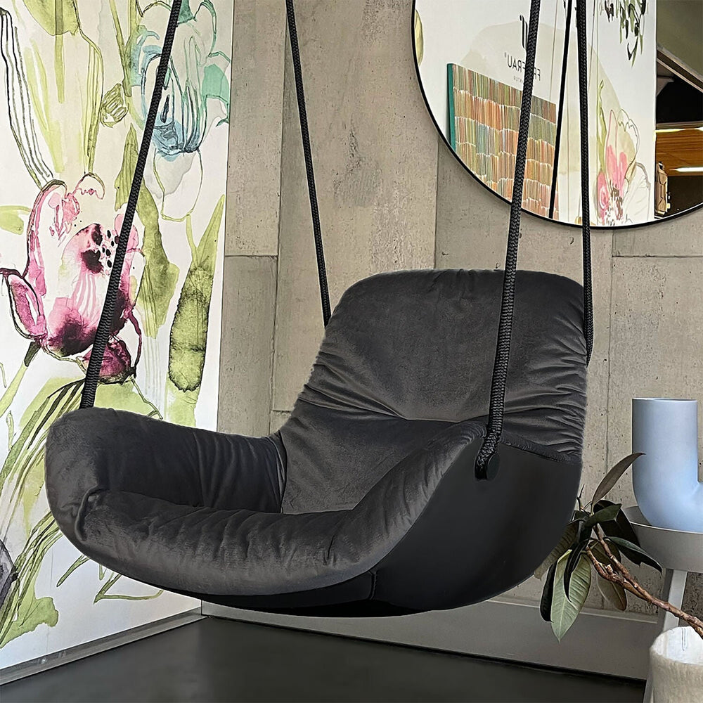 The lounge chair designed by Birgit Hoffmann and Christoph Kahleyss hangs on two sturdy black ropes from the ceiling and anyone who rocks back and forth on it is overcome with almost childlike feelings of happiness.