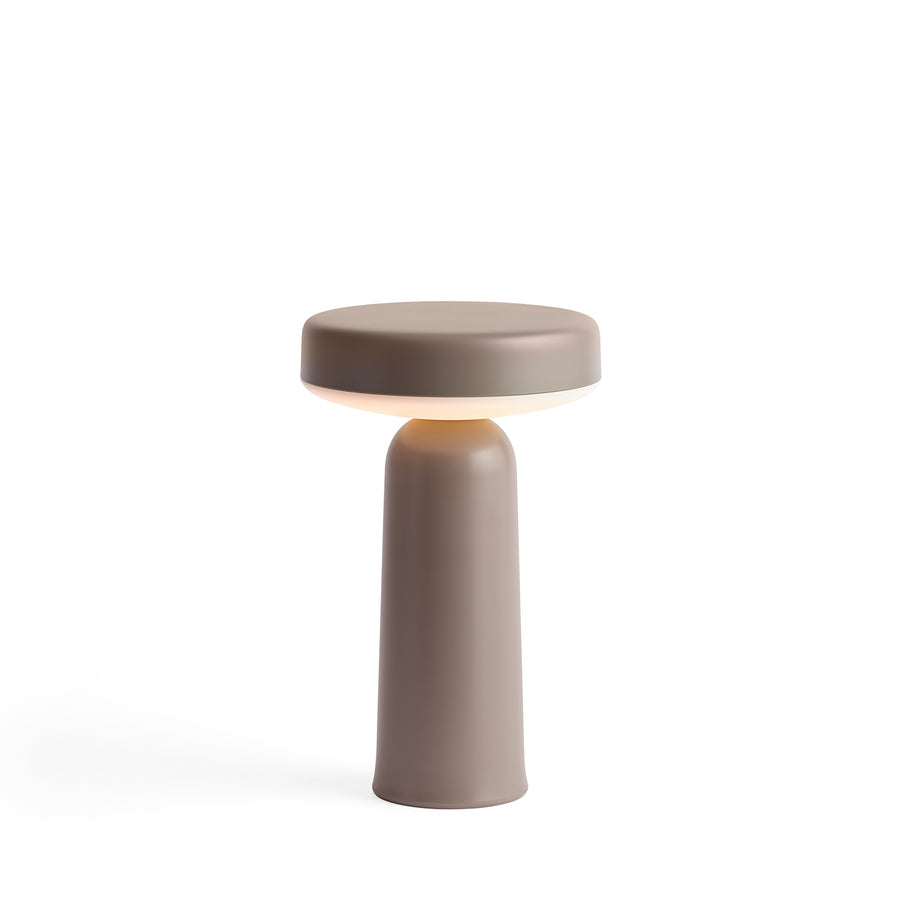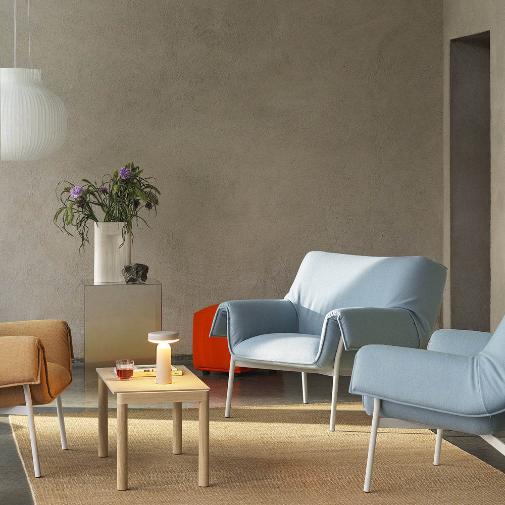 Inspired by shapes of traditional table lamps, the Muuto Ease Portable Lamp transforms this typology into a carry-able size suitable to take wherever. Ease offers a high-quality dimmable, no-glare light with 3 levels, striking a balance between atmospheric and functional light. The design has a distinct lightness to it, with the top and bottom gently touching. A slightly flared bottom mimics the lip of a vase in a grounding gesture that allows the base to be slimmer and easier to grab.