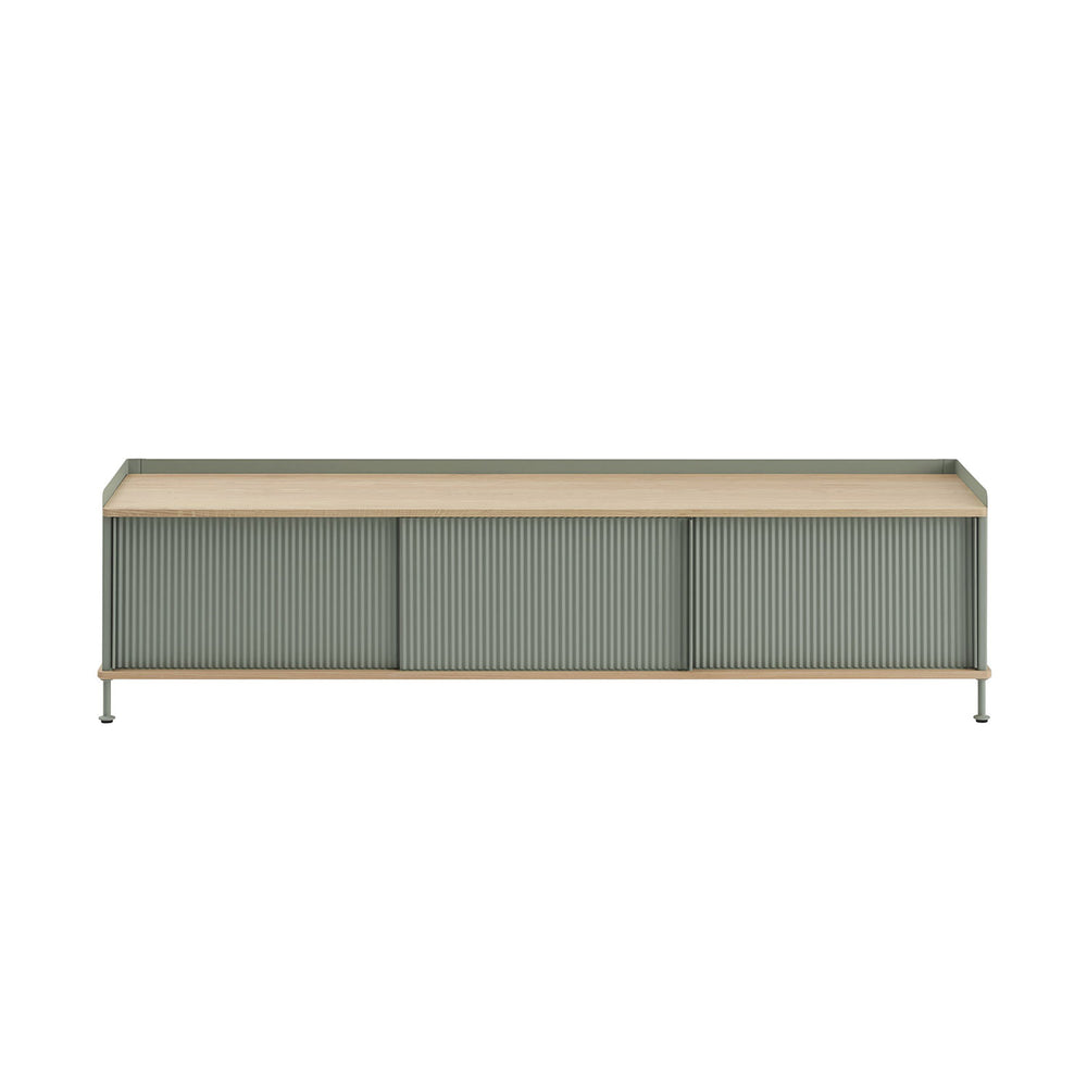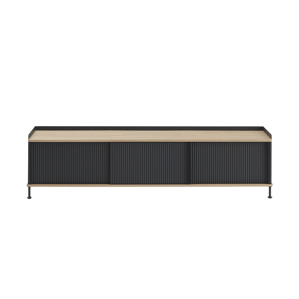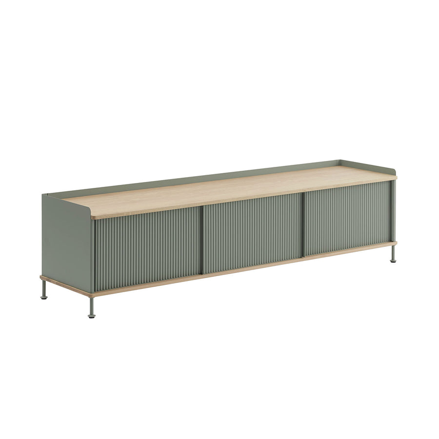 The Enfold Sideboard combines industrial materiality with residential references for a new perspective on modern storage. Made from a lacquered steel that gently enfolds its top and bottom in solid oak, the Enfold Sideboard fuses cold and warm materials for a unique expression, paired with the vibrantly modern expression of its ridged steel doors.
