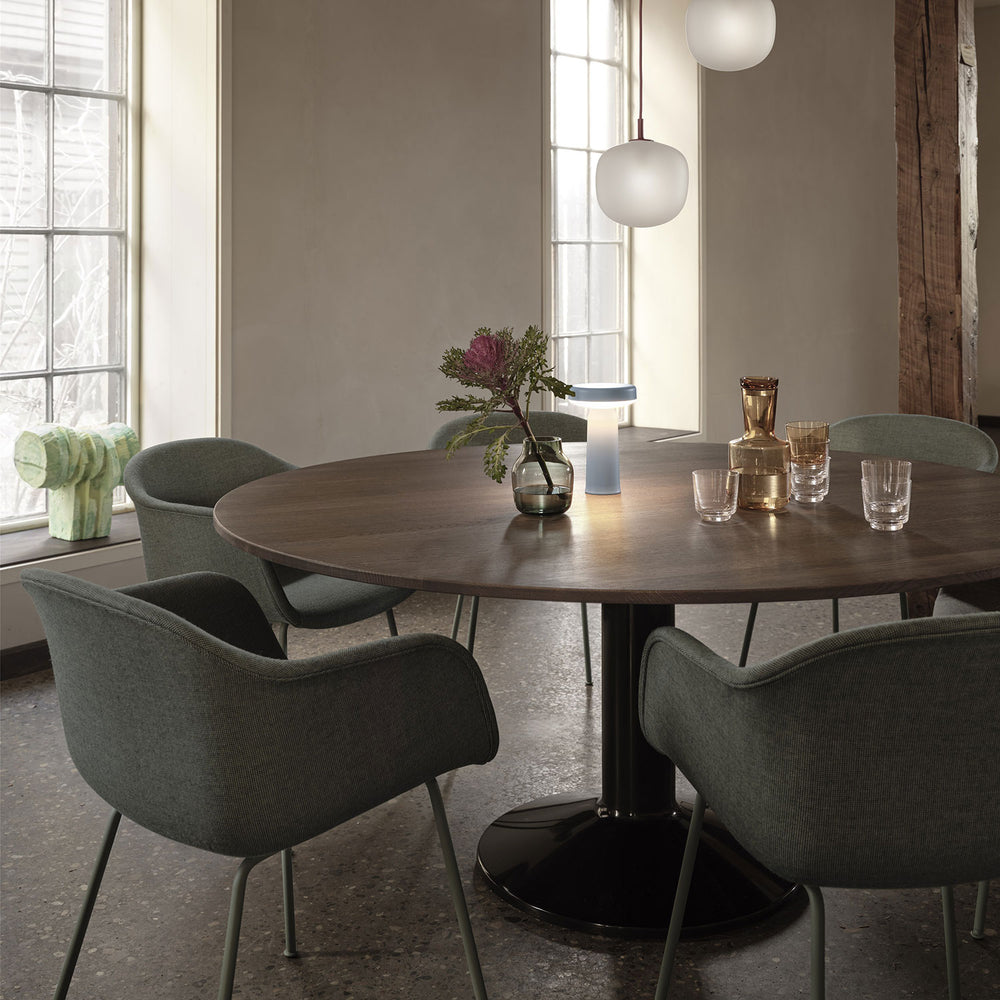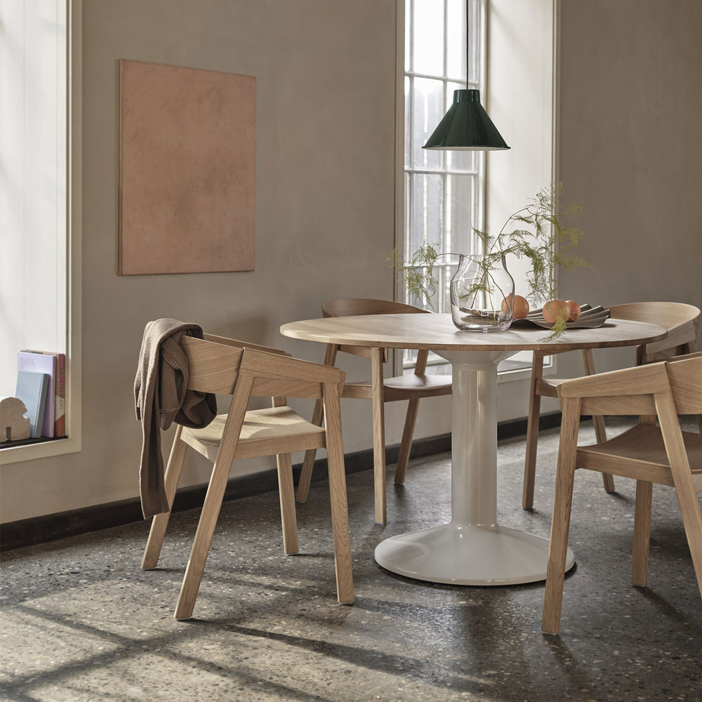 A natural focal point of the home, the Midst Table is a generous, round dining table where friends and family gather - and there is always room to squeeze in one more guest. Its refined silhouette is simple yet characteristic, enhanced by distinct detailing and contrasting materiality; matte solid oak or linoleum on a monolithic base made of spun steel with a durable high gloss finish.