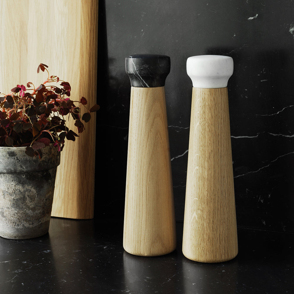The stunning mills from Normann Copenhagen are made from oak with a solid marble top. The black or white marble designates salt or pepper. Both utilise a ceramic mill.