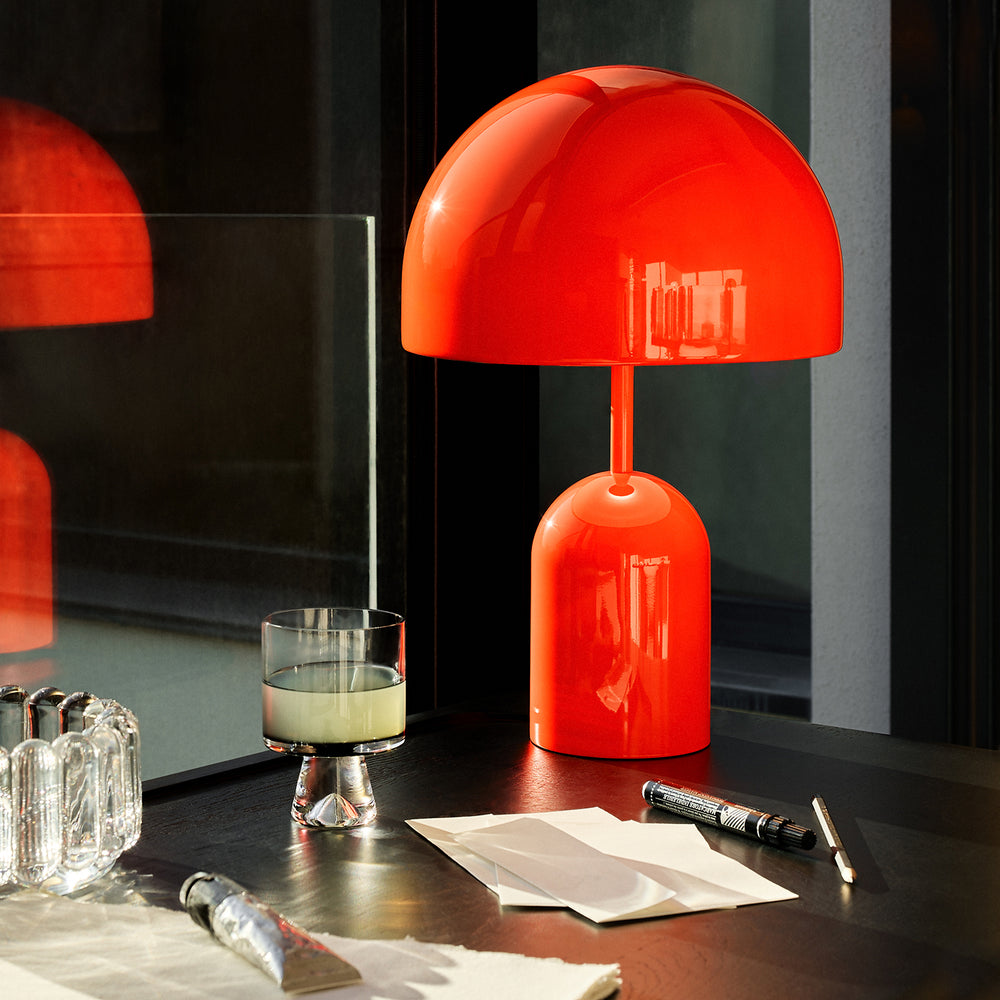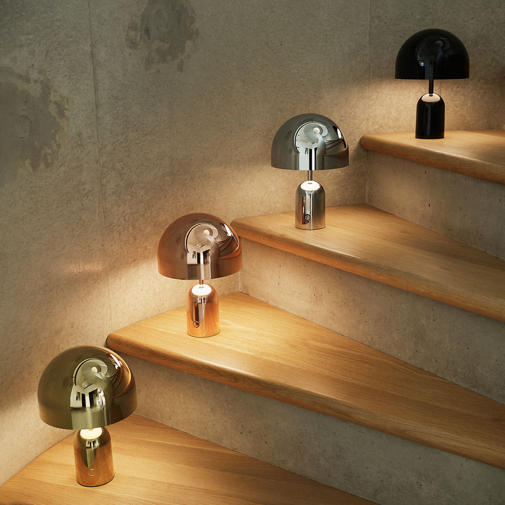 Taking its name from a classic dome shape, Bell is an exercise in reductionism. The hyper-polished surface allows Bell to take on the tone and characteristics of its surroundings while a concealed diffuser produces its soft lighting. Please note: Table lamps need to be plugged in, portables are re-chargeable.