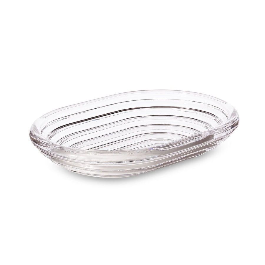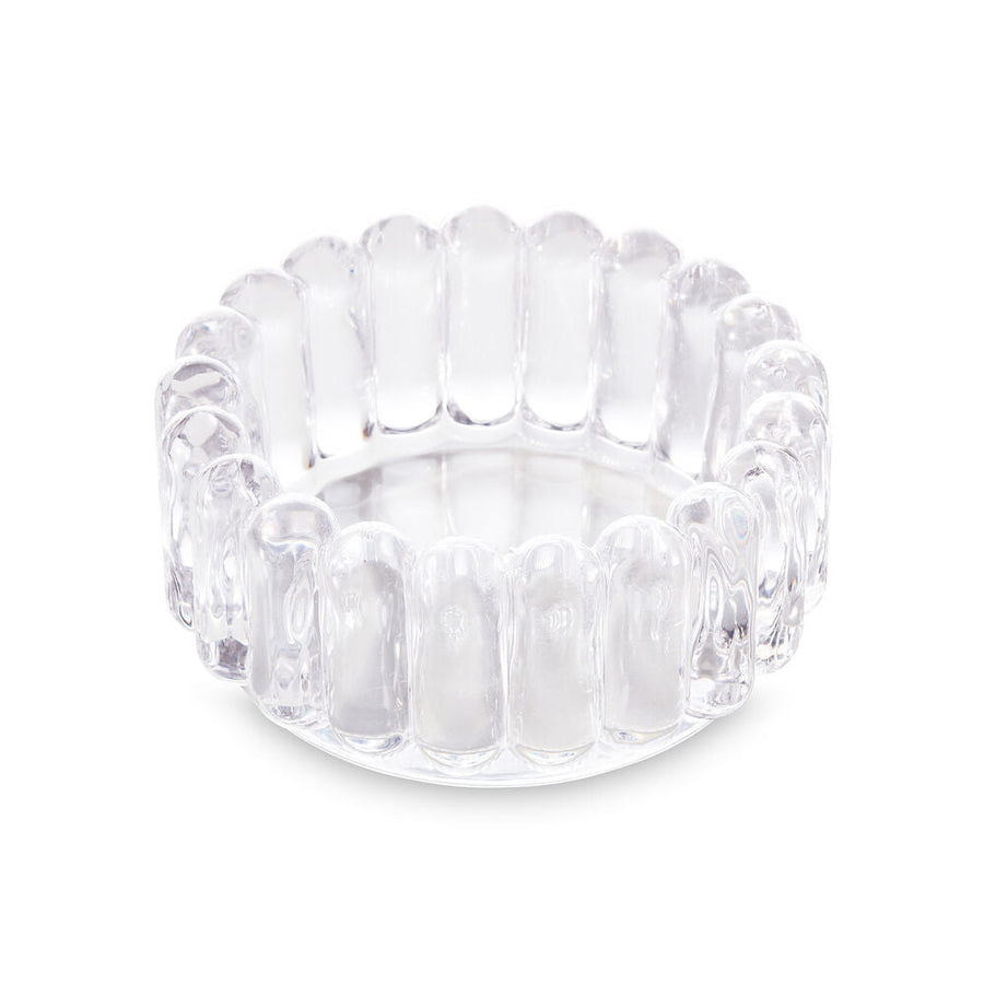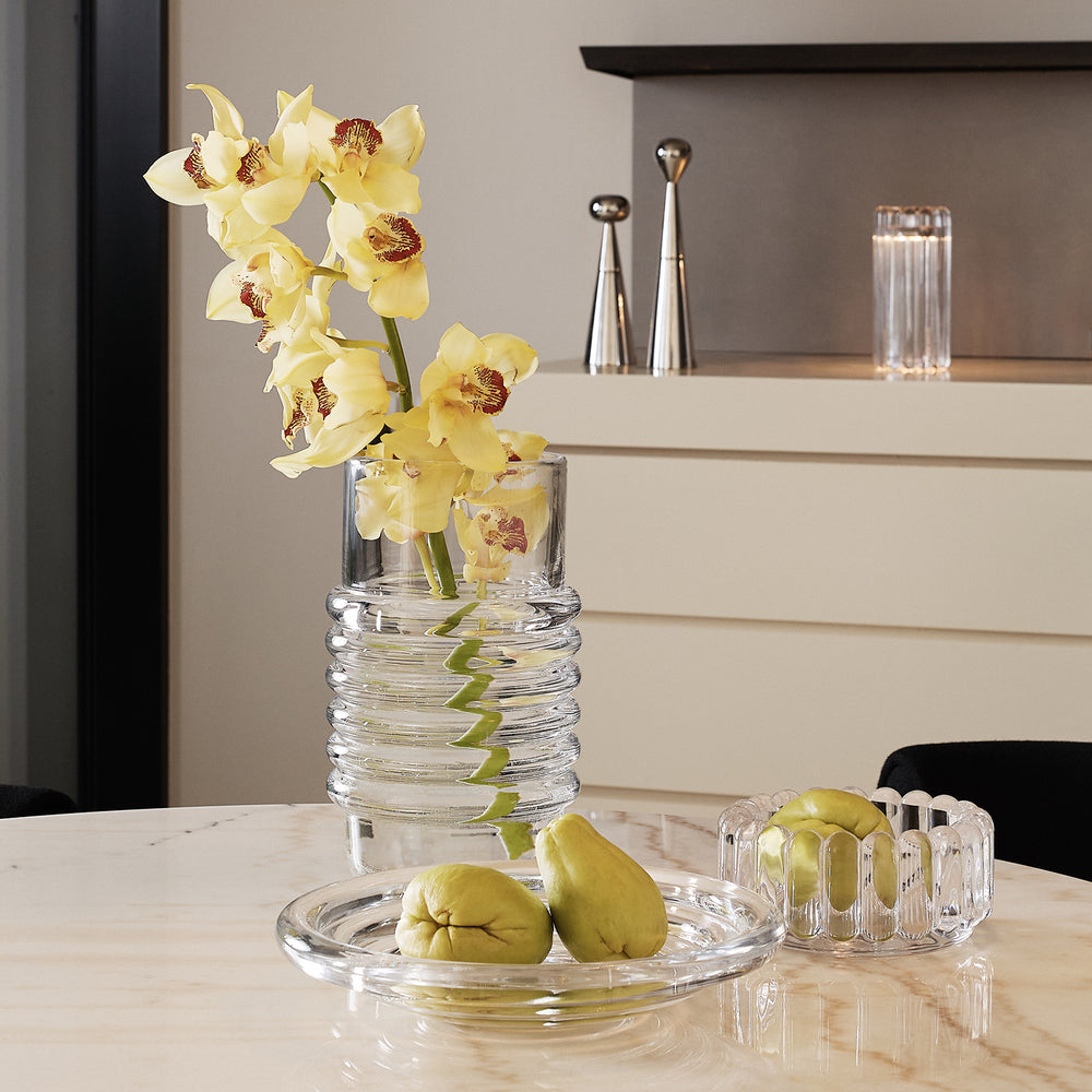 Press series is designed and engineered to catch and refract light, and to last for ever. These heavyweight grooved pieces are made of fat, chunky coils of pure and clear transparent glass.
