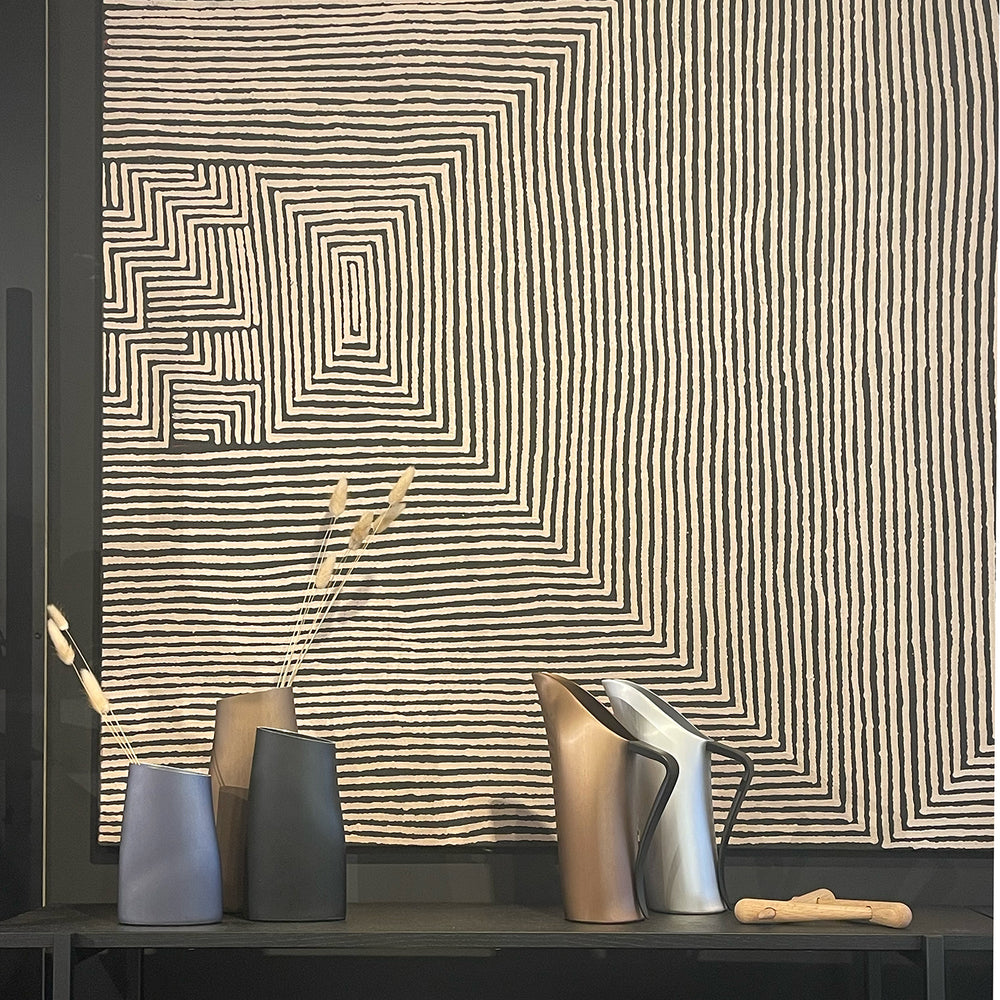 Elizabeth is known for her Escher-like, geometric painting style. Her paintings include Dreamtime stories from her fathers land Kalipinya, 400 kilometres West of Alice Springs. Theme’s include lightning, thunder, flooding, creeks and rock holes.