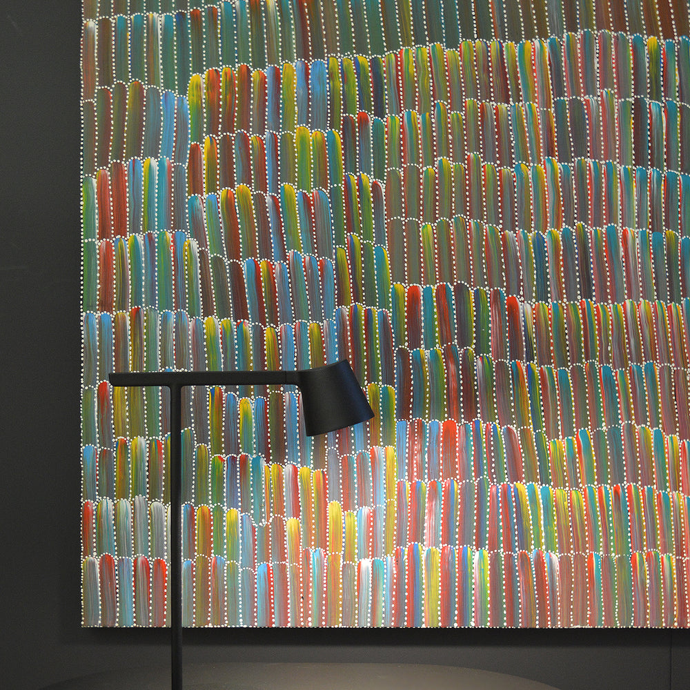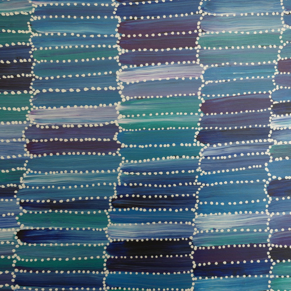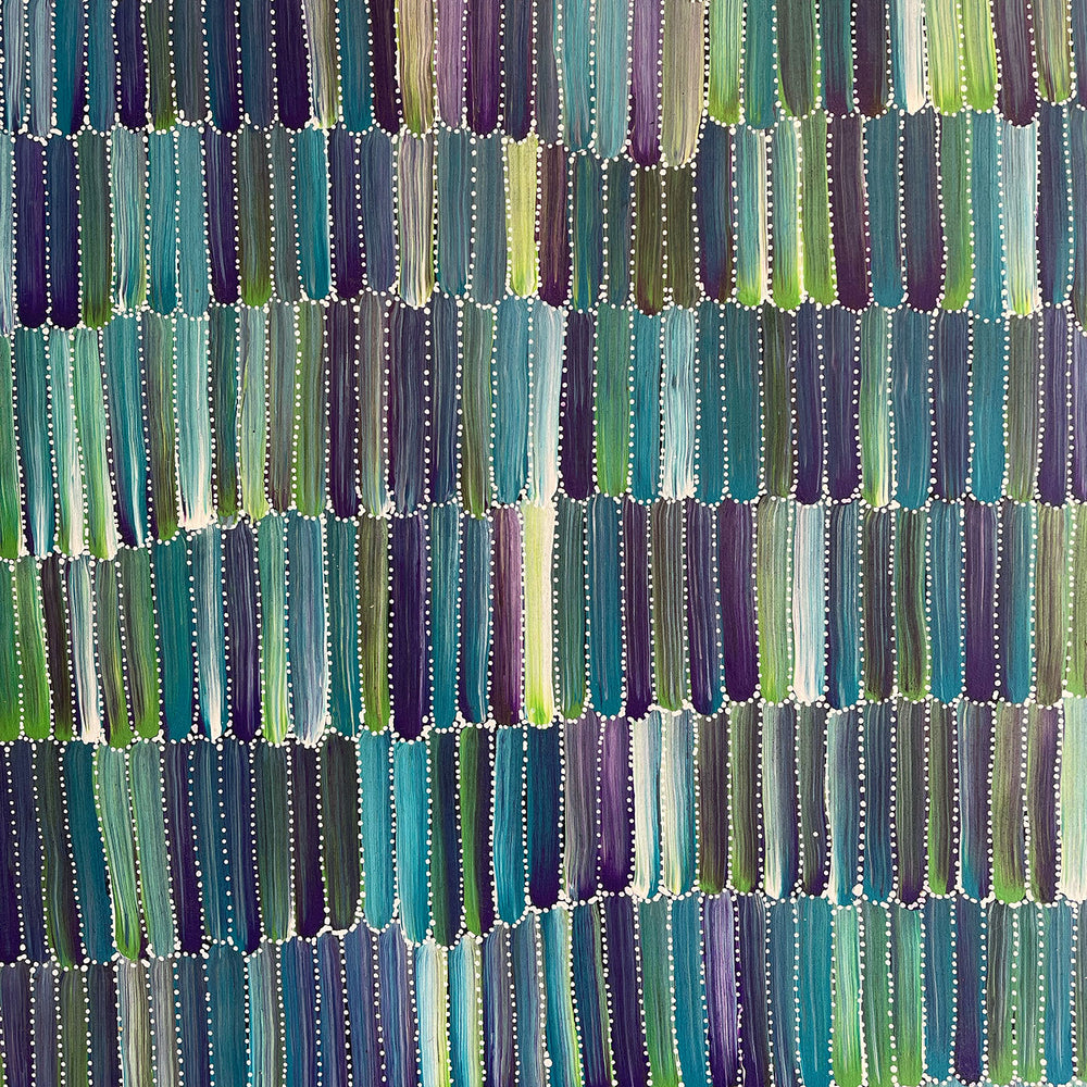 Jeannie’s representation of her dreaming, takes the viewer on a colourful, flowing visual journey. Jeannie uses multiple hues of bright, complementary colours, surrounded with fine dot work, to produce a fine representation of the bush yam."