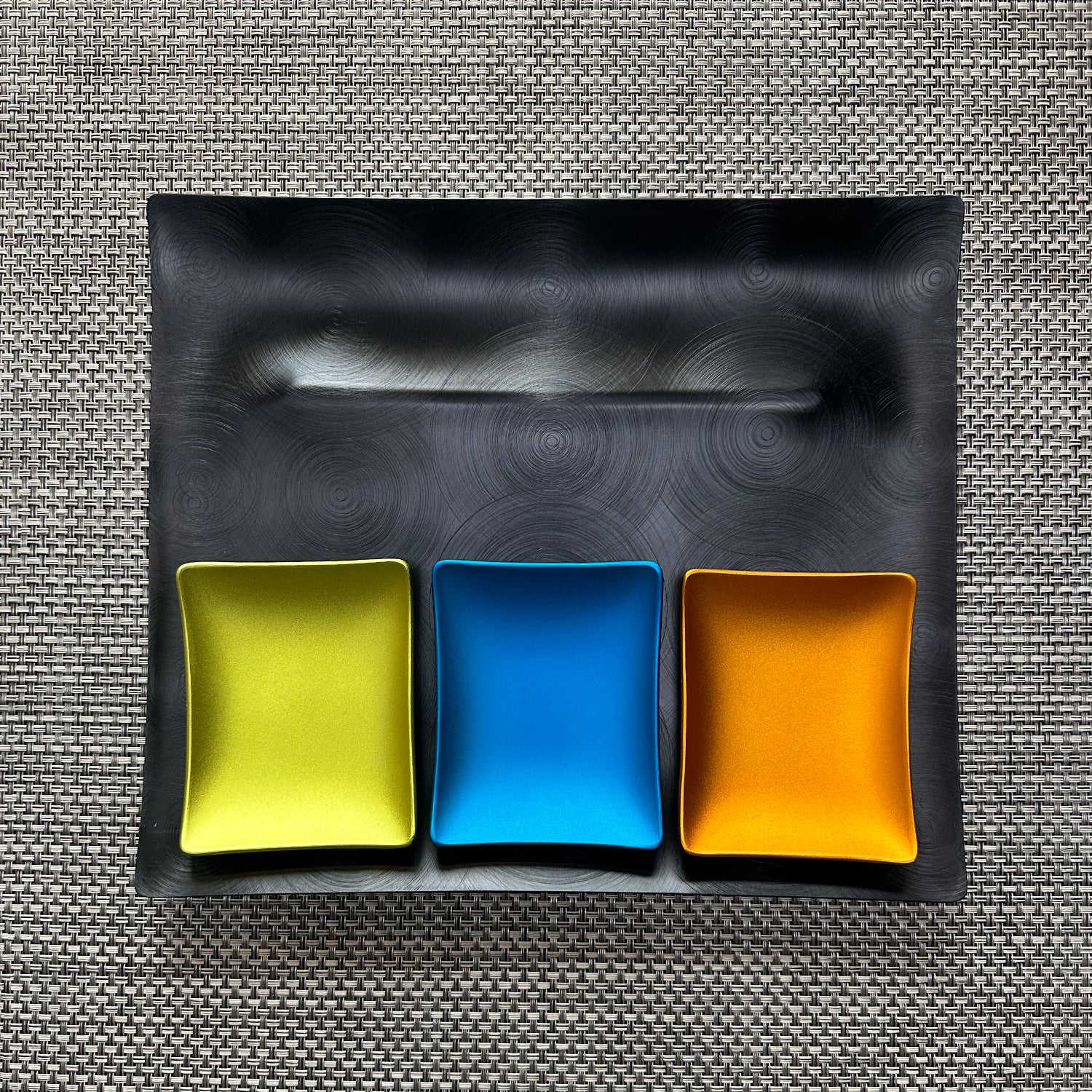 The anodised aluminium Tapas condiment trays are part of the Fink Tapas collection. They have been cold-pressed and are designed either to be placed upon the Tapas platter or served by its side.