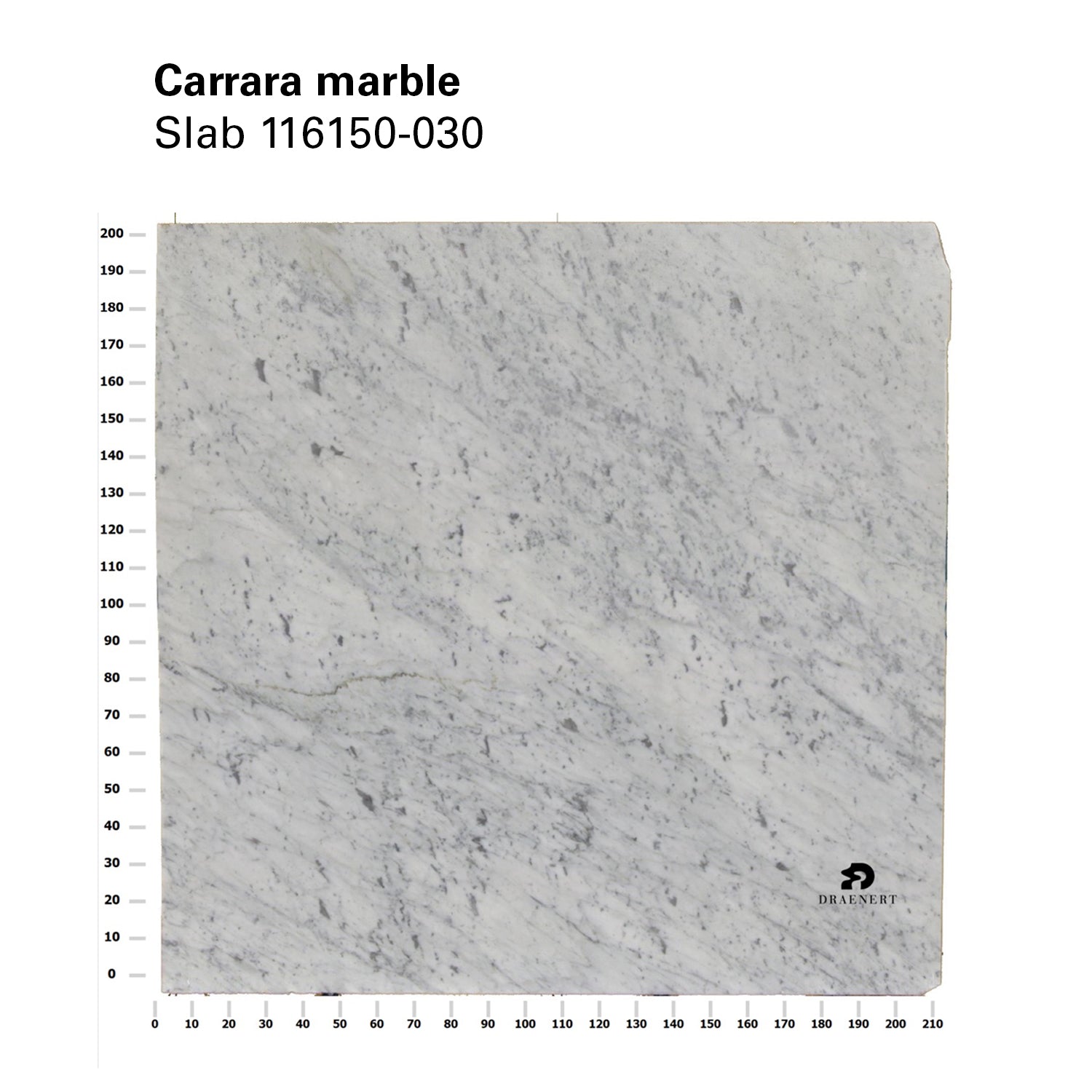 White-grey marble with a grain size of 0.5 mm. Graphite deposits run through the stone in the form of grey veins, dots and clouds. Due to its homogeneity and crystal structure, this natural stone is very easy to polish. Small crater-like pores (tarolli) are possible in the polished surface, open gas bubbles that run through the entire stone structure. Fine fault cracks are also part of the appearance. In the Apuan Mountains around Carrara, marble types of different degrees of brightness and structure are mined in over 1000 quarries.