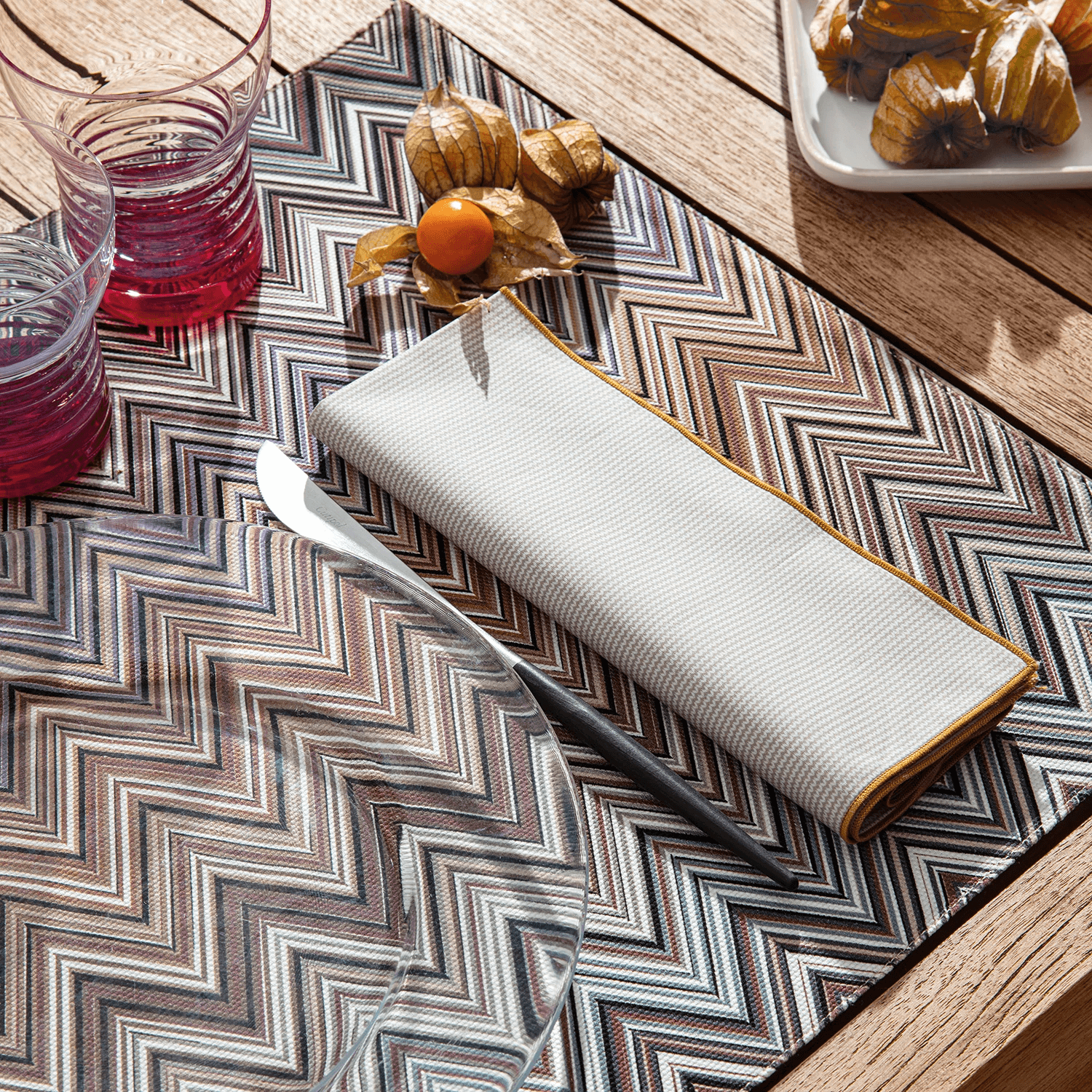 This table collection is a must for every Missoni lover. Get rid of the disposable paper napkins at special dinners and lunches. 100% cotton napkins edged in individual colours to distinguish your napkin and elegantly tie back to the Missoni runners and table mats.