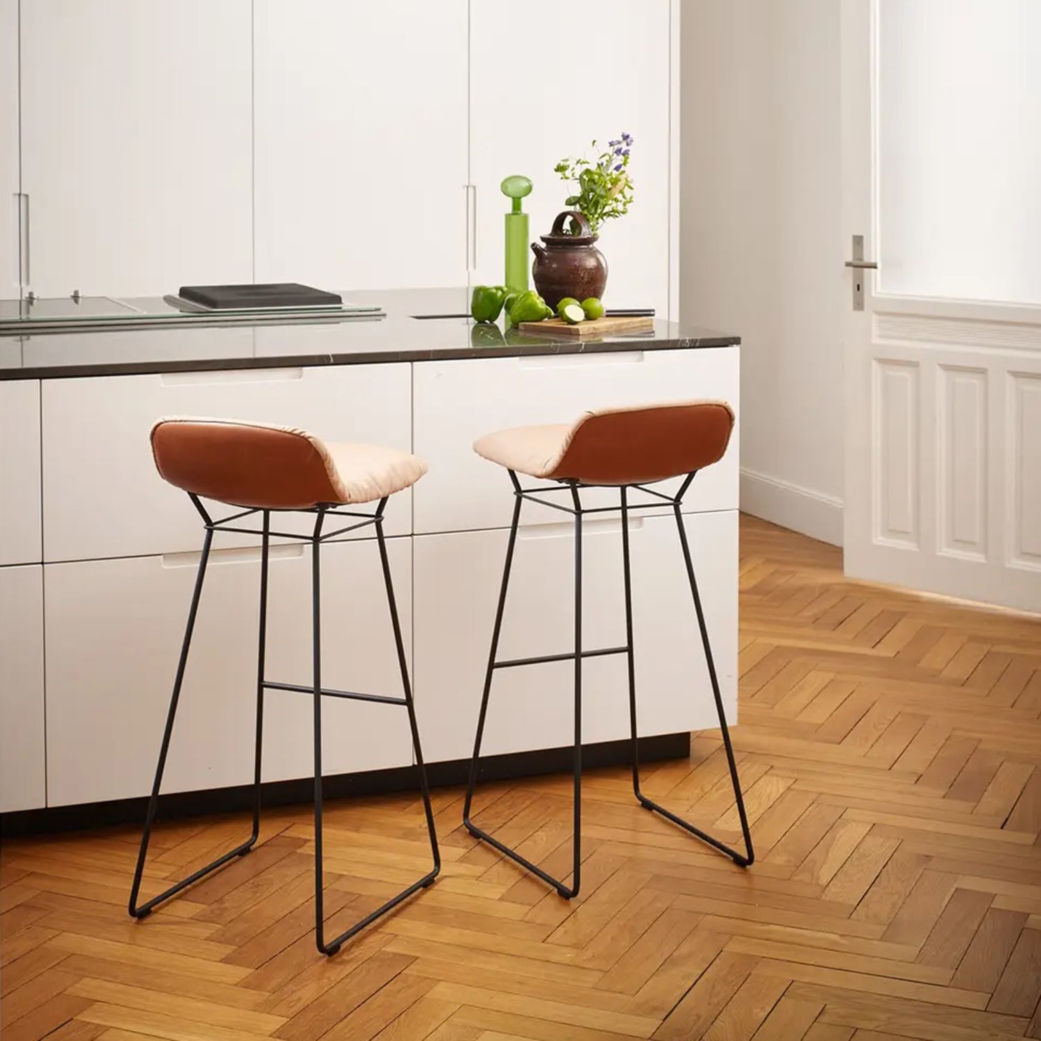 Leya reconciles contradictions in a wonderful way. With its tautly upholstered shell, the barstool designed by Birgit Hoffmann and Christoph Kahleyss makes a clear and linear impression from the outside, but you'll feel the outstanding comfort the moment you sit down. The external padding reveals a soft cushion on the inside for an almost sensory experience. This pure design is available in a range of premium quality coverings and either on a delicately-poised wire frame or on a height-adjustable swivel column base; an elegant high back provides an extra level of comfort.