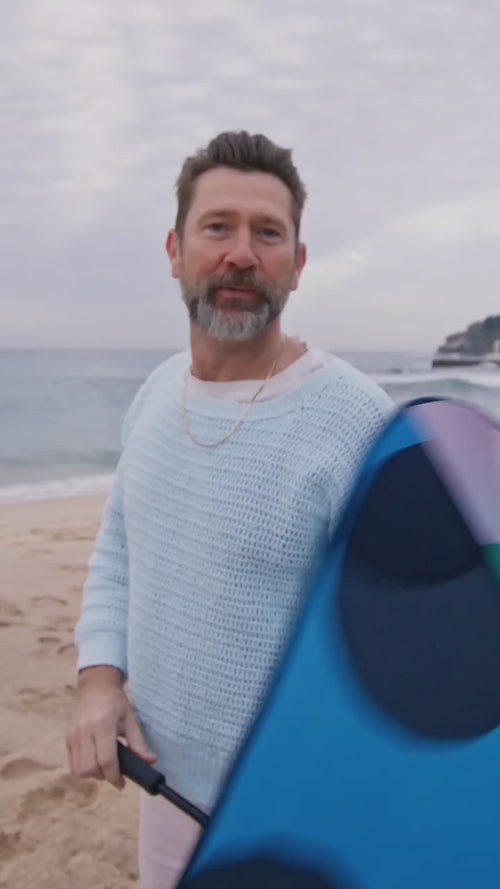 Straight from his Bondi studio, Daimon Downey brought his signature collage style to life. What began with cut paper and painted shapes became a sculptural umbrella, designed to move with you and brighten grey days. A sense of optimism pulses through the design. A kaleidoscope of painted paper and collage, each detail speaks to Daimon's playful process and optimistic vision.