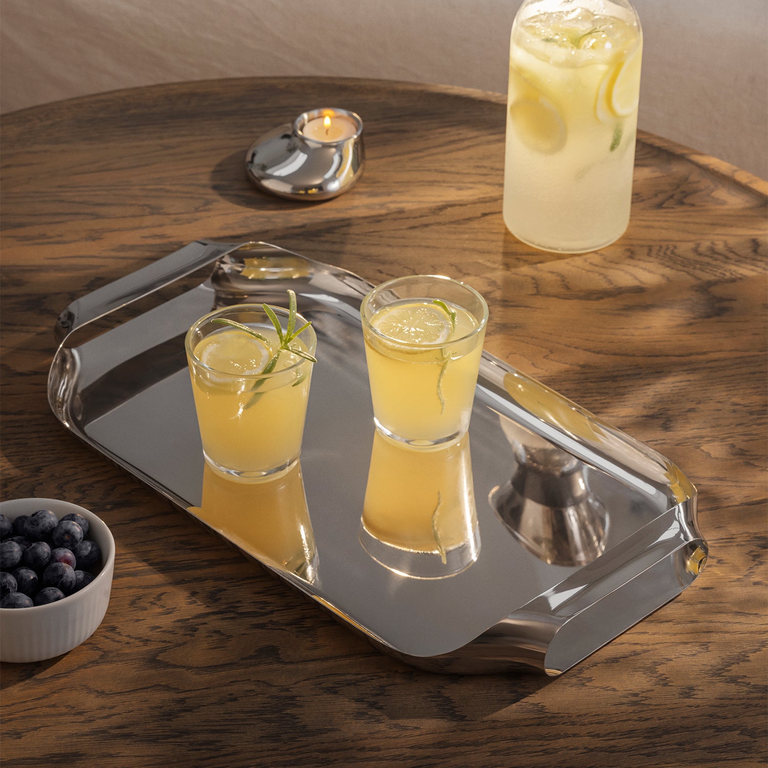This elegant serving tray enhances the appeal of everything served, from breakfast in bed to chilled drinks on the patio. The clean, sleek lines are achieved by producing the tray from a single piece of steel with no unsightly welds. The deep-set handles enhance stability and balance even when the tray is fully laden.