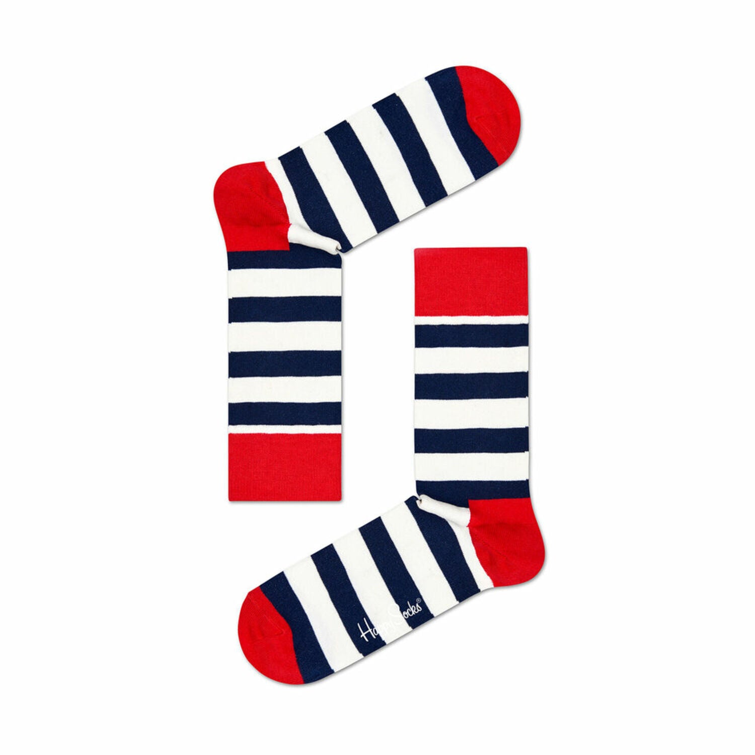 Add a splash of red, white and blue to your sock drawer with this gift box set from Happy Socks. Filled with four pairs of our favorite socks, this matching box is covered in red, white and blue stripes for a simple yet luxurious gift. The combed cotton socks feature Polka Dot, Stripe, Filled Optic and Half Stripe for a unique and colourful combination.