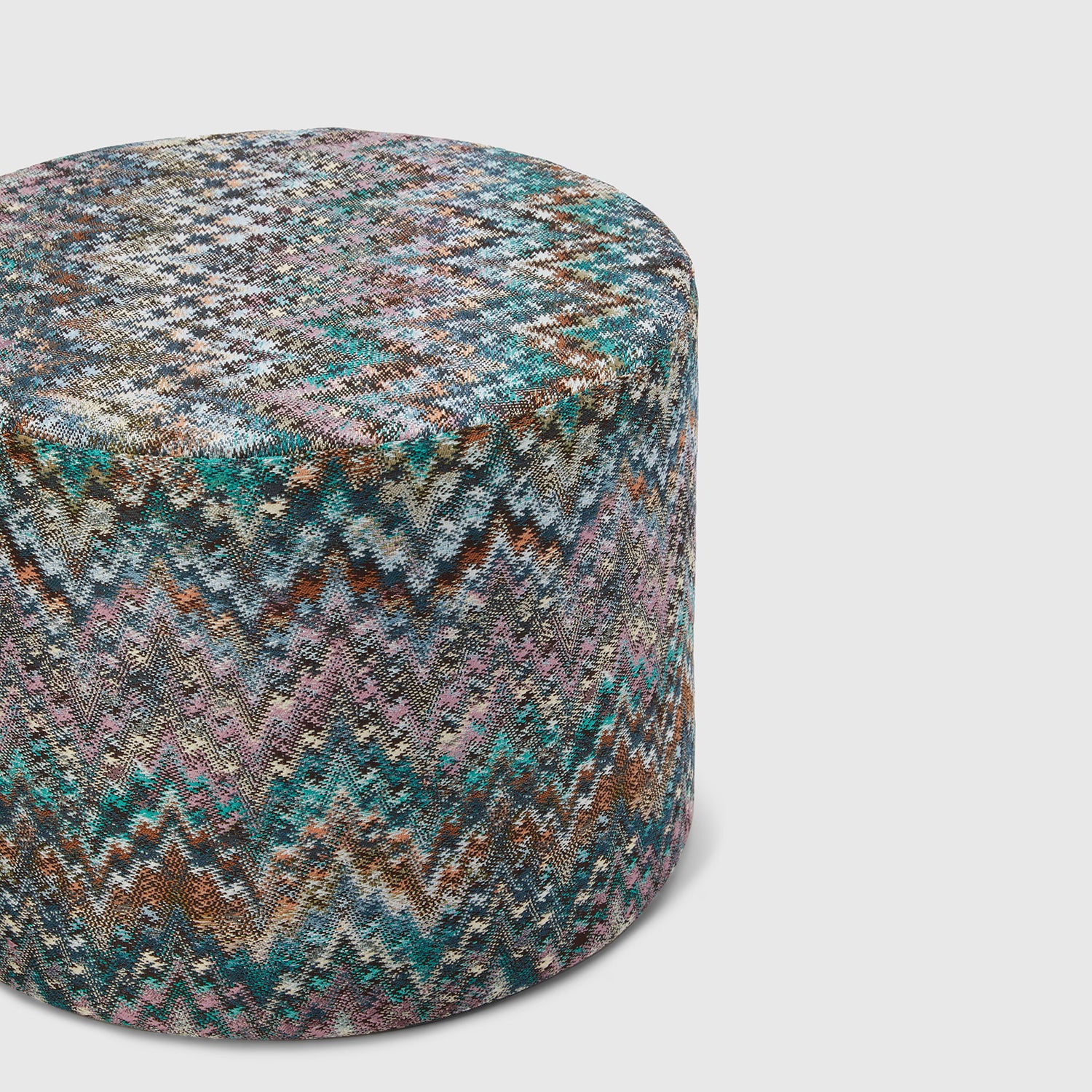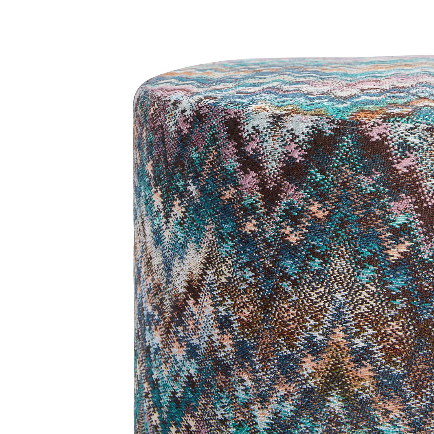 An elaborate irregular chevron pattern characterises the surface of the Parrot cylindrical pouf. The zig-zags decorating the pouf create a fascinating optical illusion effect. Missoni's textile craftsmanship manifests itself in all its beauty in this furnishing accessory. Complete with logo label, the Parrot pouf represents a perfect fusion of design and craftsmanship.