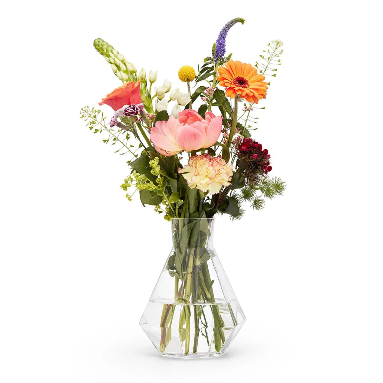 Cut from mouth-blown crystal and crafted into an elegant diamond shape, this unique pitcher can stand tall or sit on its side without spilling a drop. The intentional interplay of glass, liquid and light immediately draws the eye and creates a perfect centrepiece.