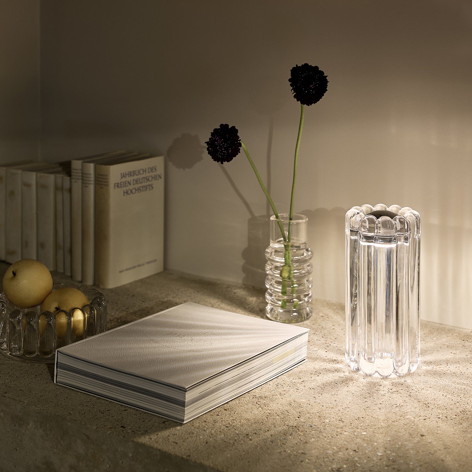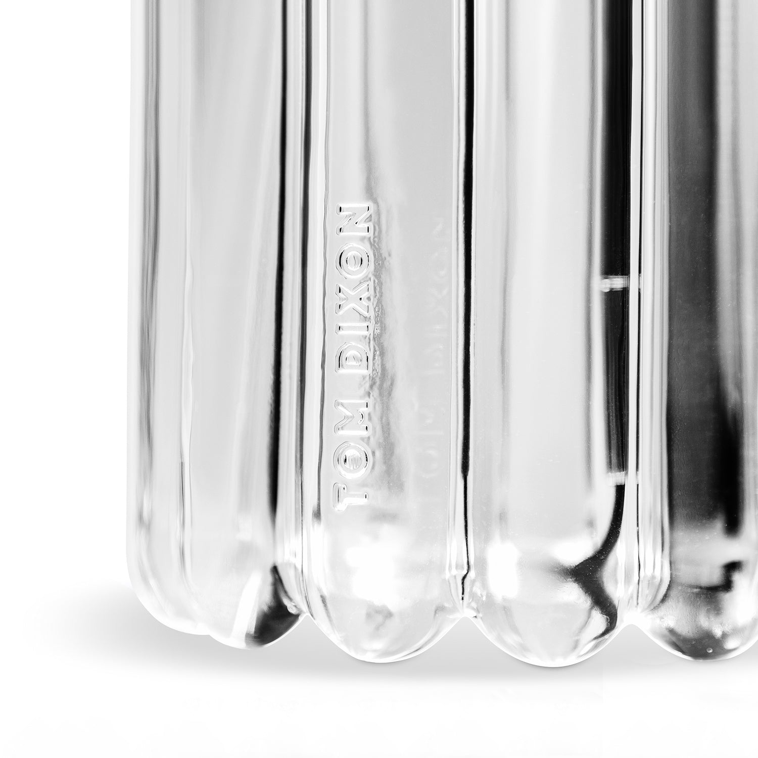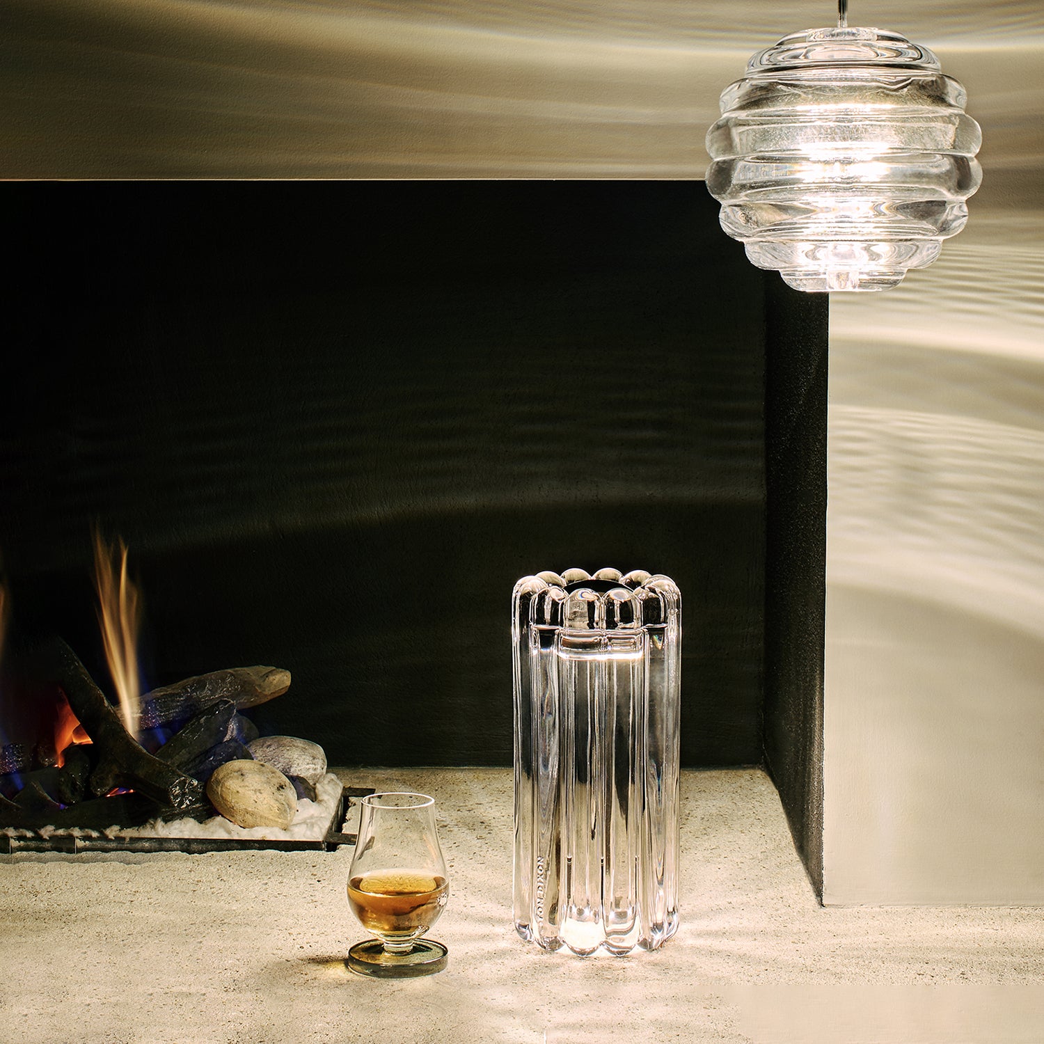 The thickest industrially Pressed glass artefacts designed and engineered to catch and refract light, and to last for ever. Press is a series of heavyweight grooved lighting, vases, bowls and candleholders made of fat, chunky coils of pure and clear transparent glass.