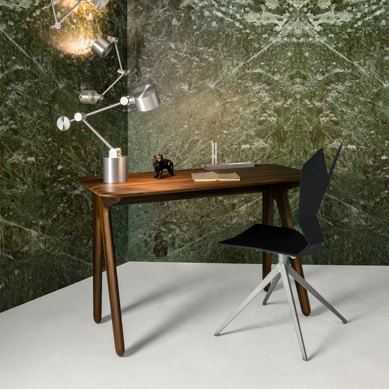 Slab Desk is part of a series of robust pieces constructed in angular forms of inviting simplicity. Made in Lithuania using solid wood Oak construction, this individual desk is celebrating the natural beauty of Fumed Oak. The surface is deeply brushed to expose the natural grain. Inspired by the archetypical Victorian school desk, this contemporary work station is equally comfortable as a hotel room desk or a dressing table.