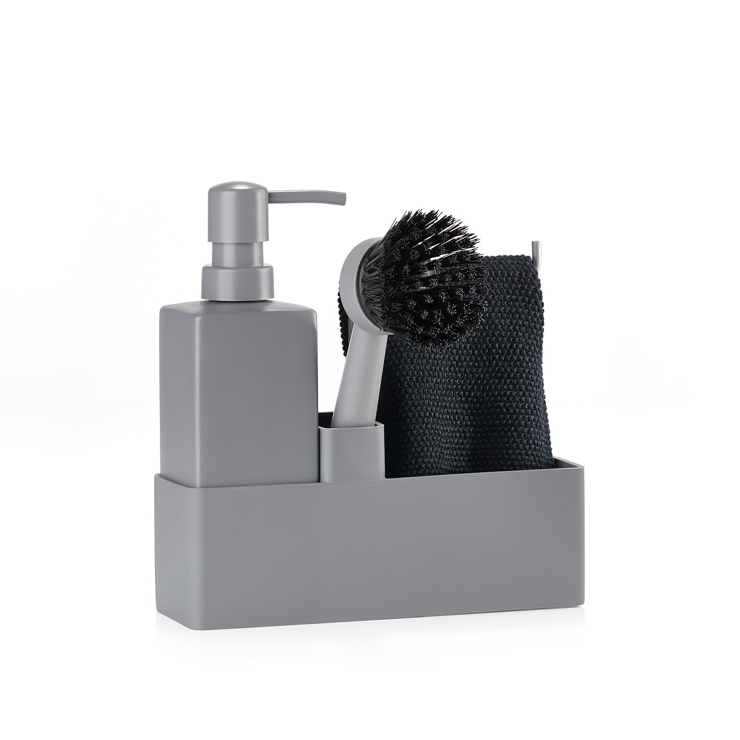All-in-one dishwashing set with cloth from Zone Denmark. The soap dispenser is made of solid ceramic, and the storage part is made of scratch-free and easy-to-clean silicone. The brush can stand on its own and the brush head can be replaced, so you always have a fresh brush.