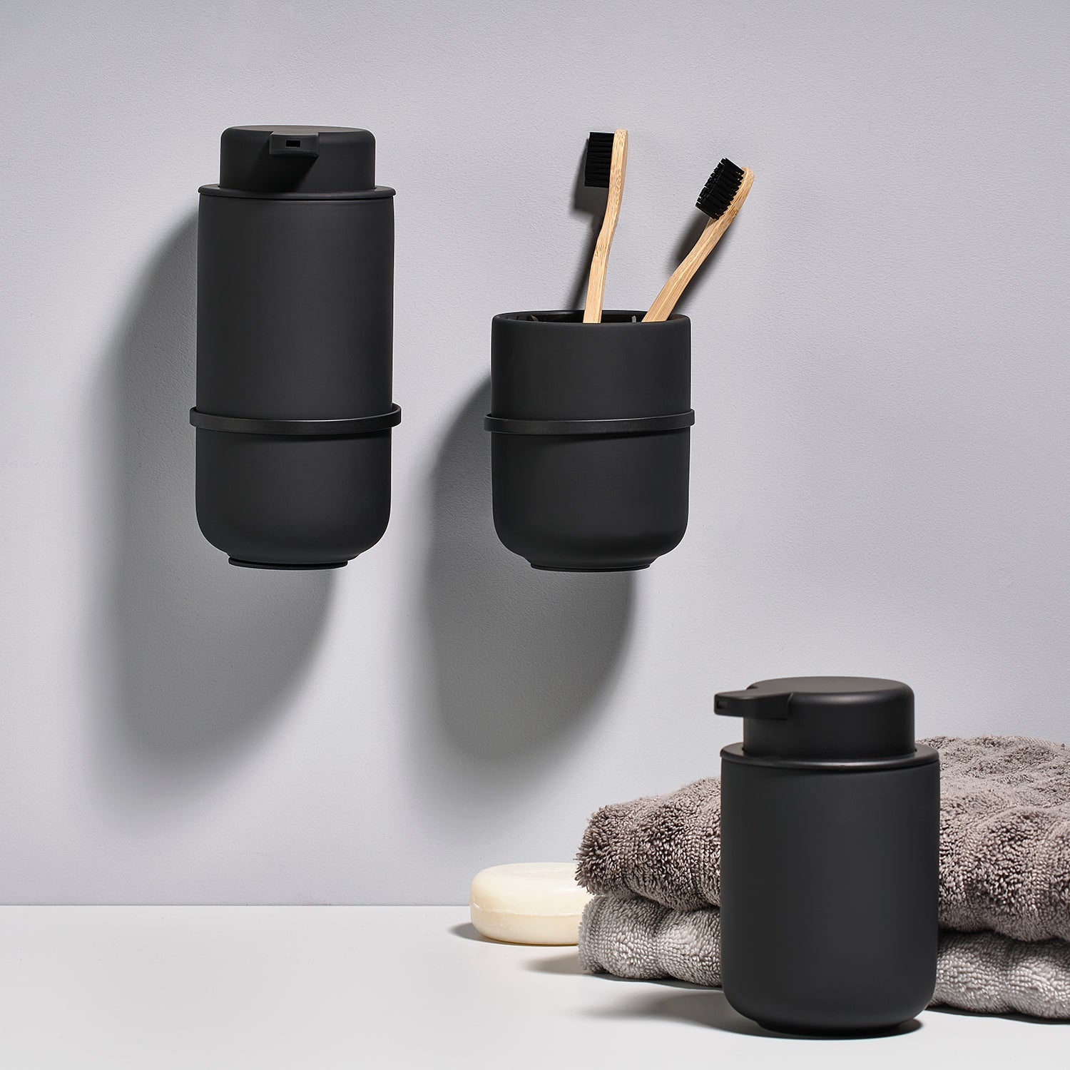 The holder is designed for soap dispensers and toothbrush cups from the Ume series by Zone Denmark.